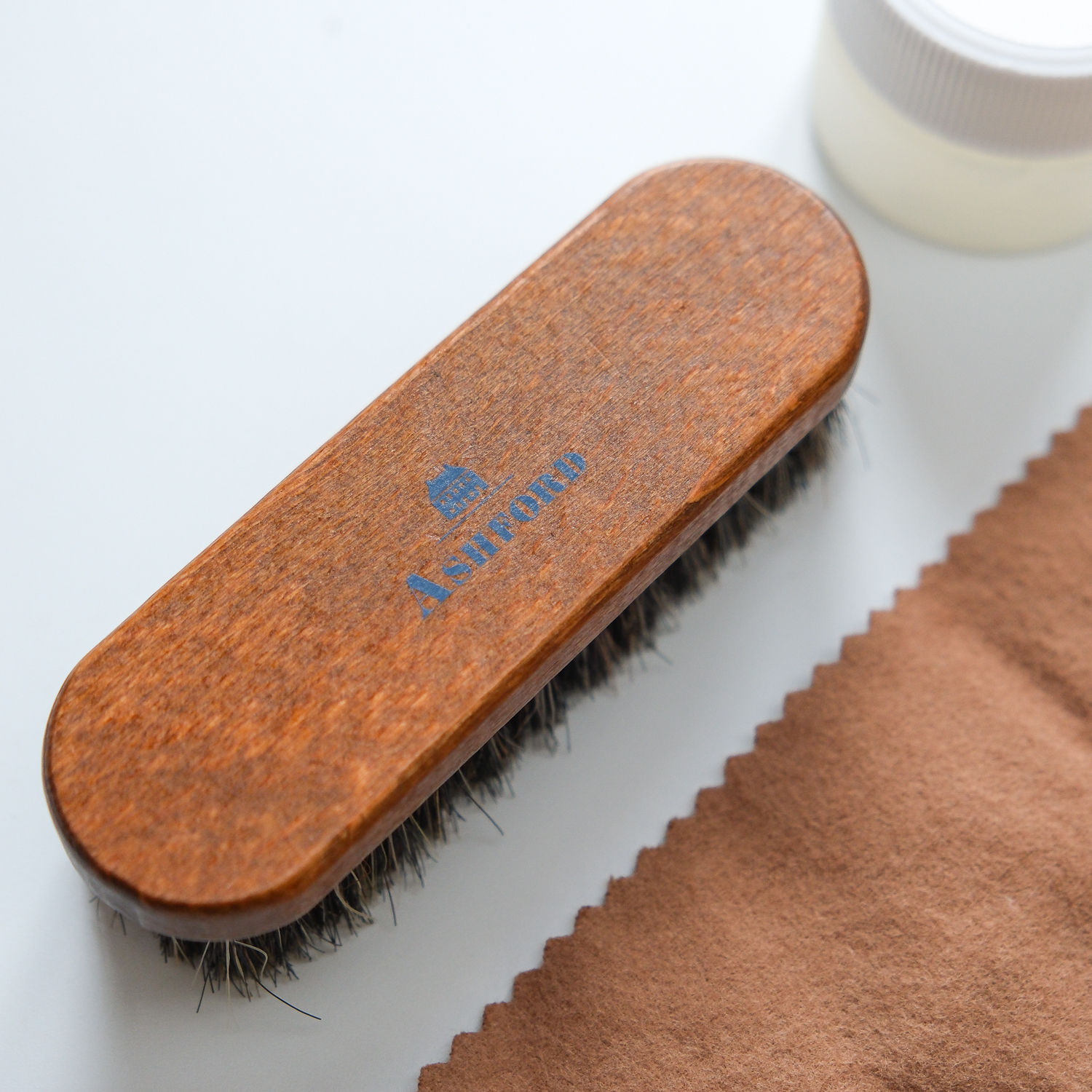 木製的皮革用馬毛刷、小罐的光澤保養油、 保養油用的擦拭布