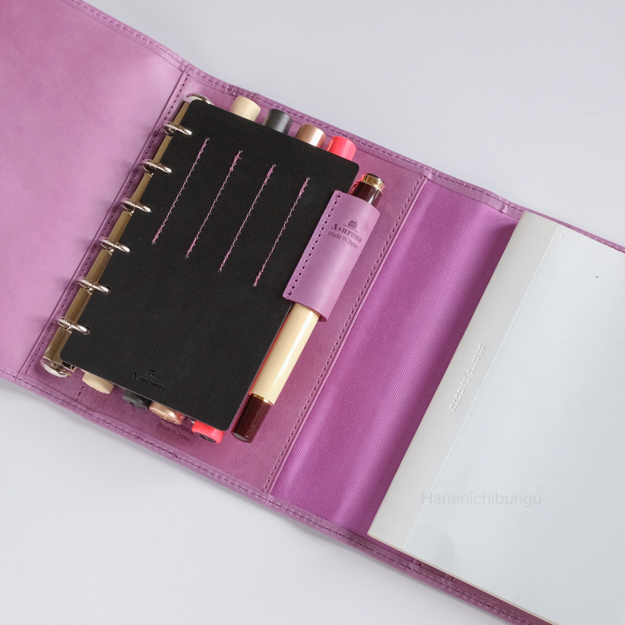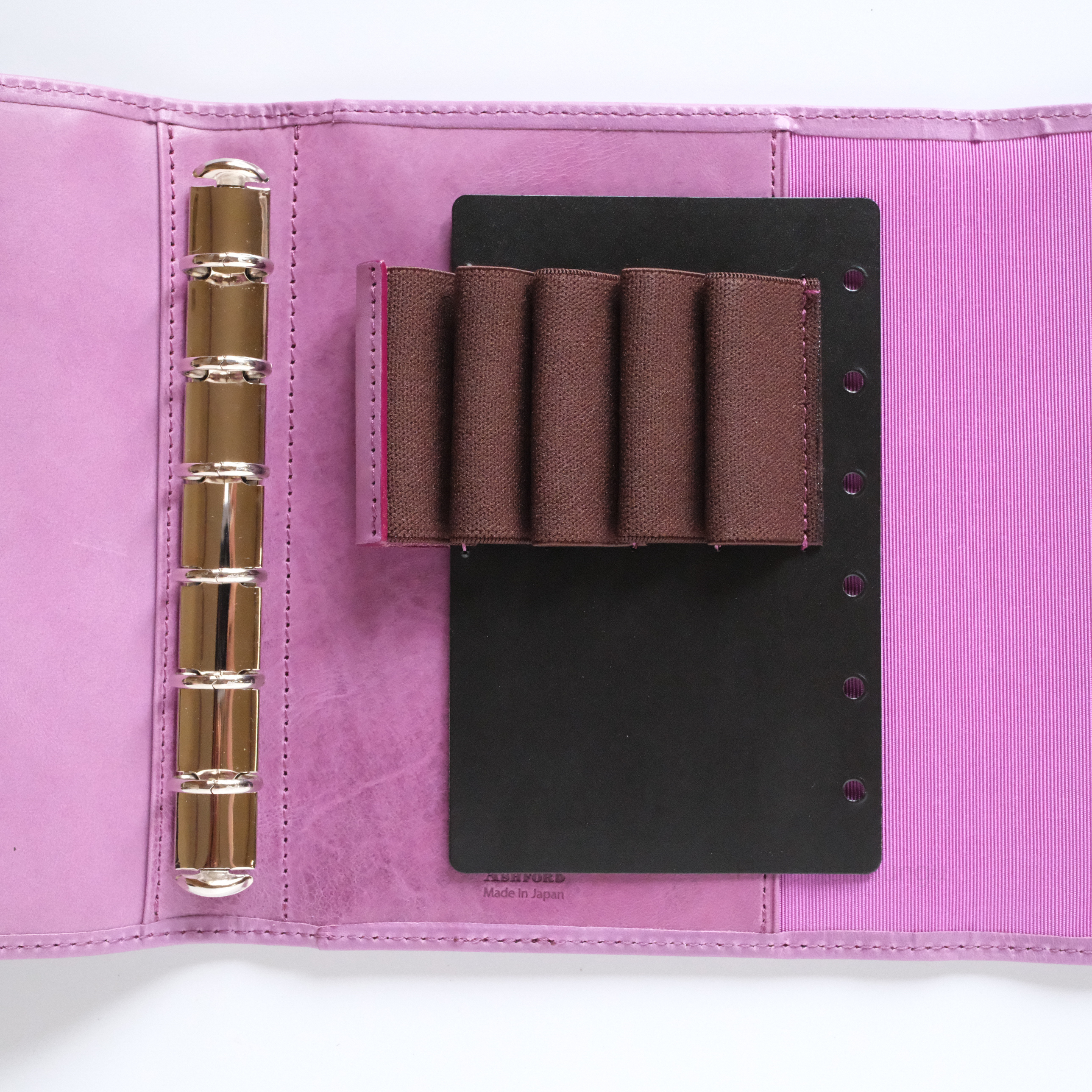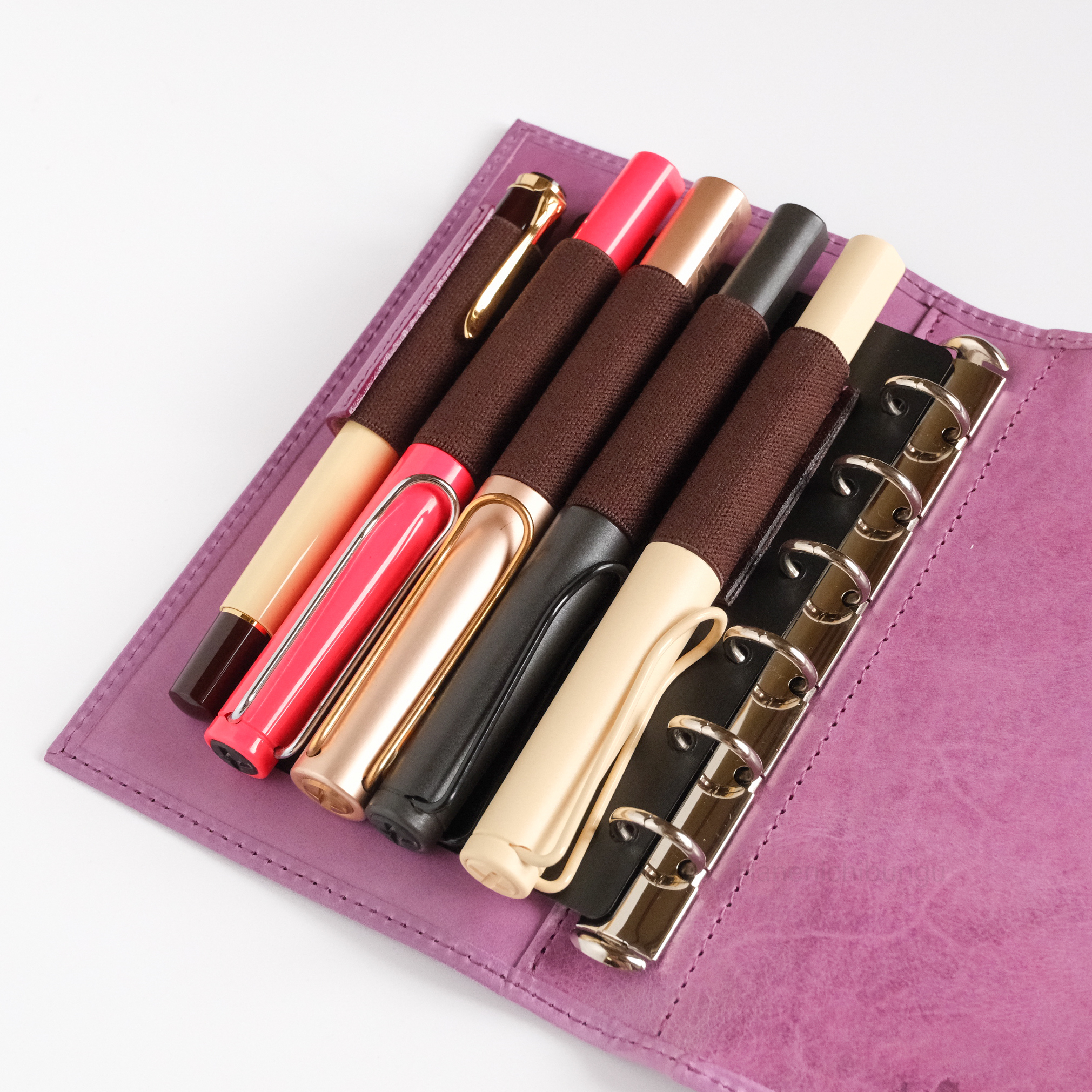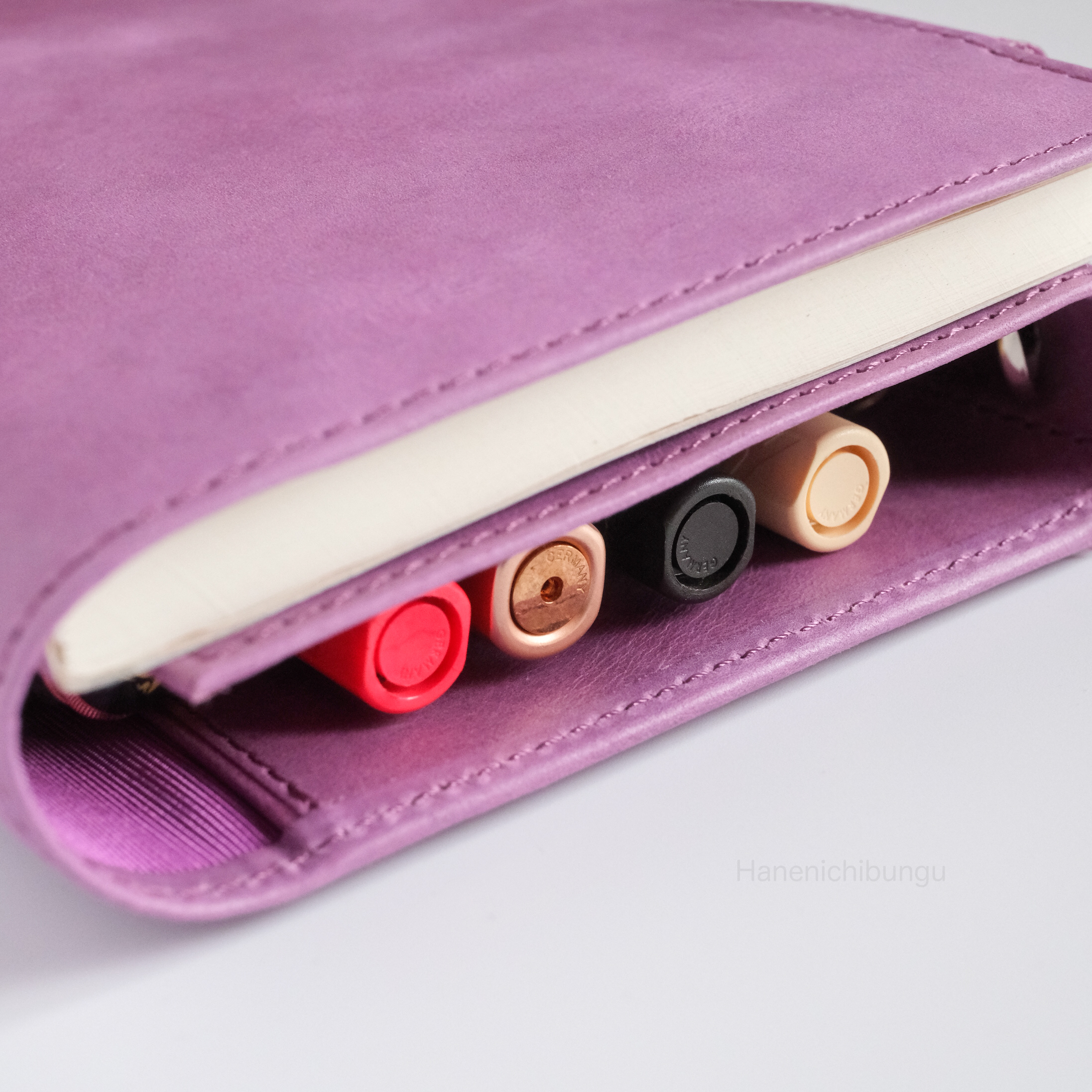 最外側的筆插是以牛皮加上鬆緊帶製成,最大可放直徑12mm的筆。